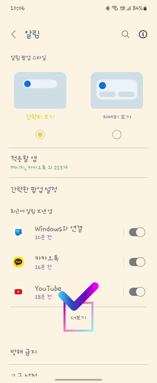 4. 파업창으로 보기를 off 하고 알림 창으로 보기 on을 해주면 됩니다.